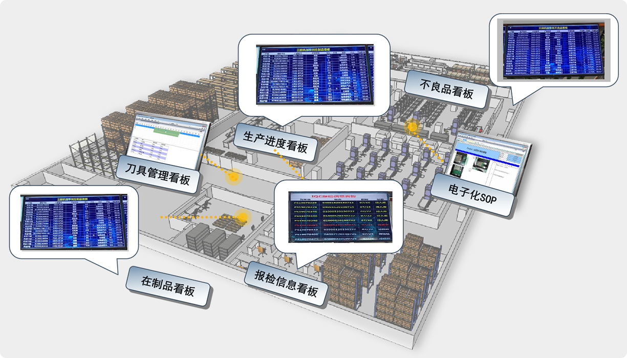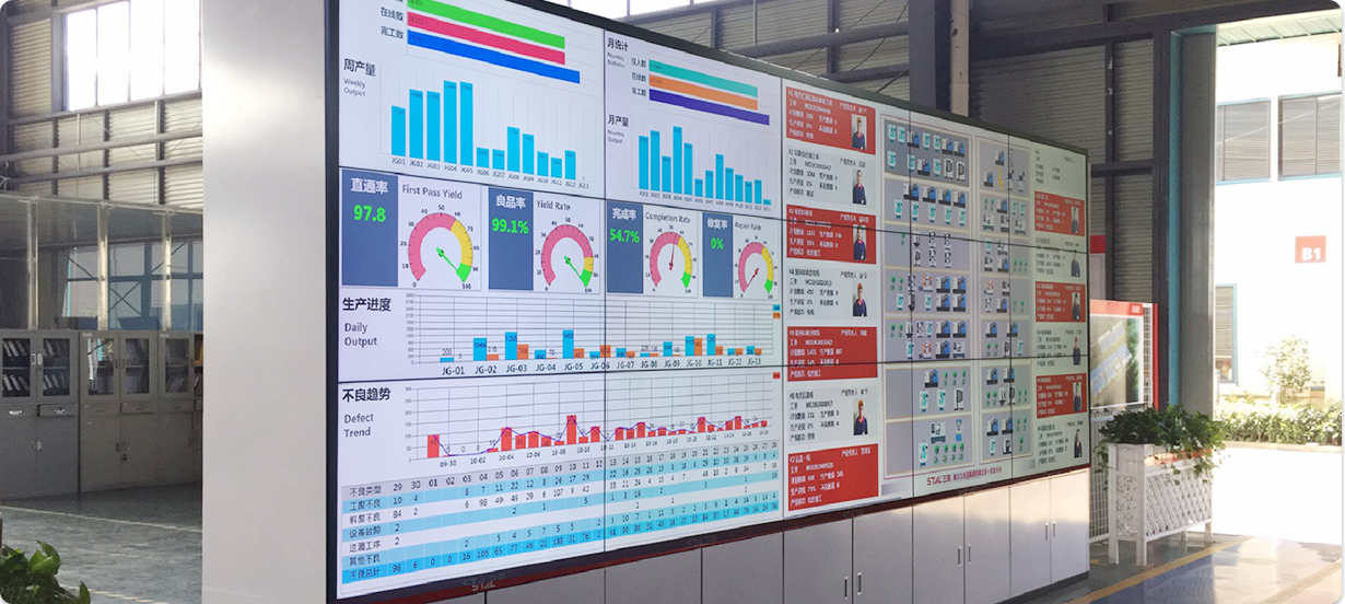 在現場建立可視化看板,使車間負責人和產區管理者都能對生產情況一目瞭然;同時輔助現場管理,供現場管理者實時下達決策。
